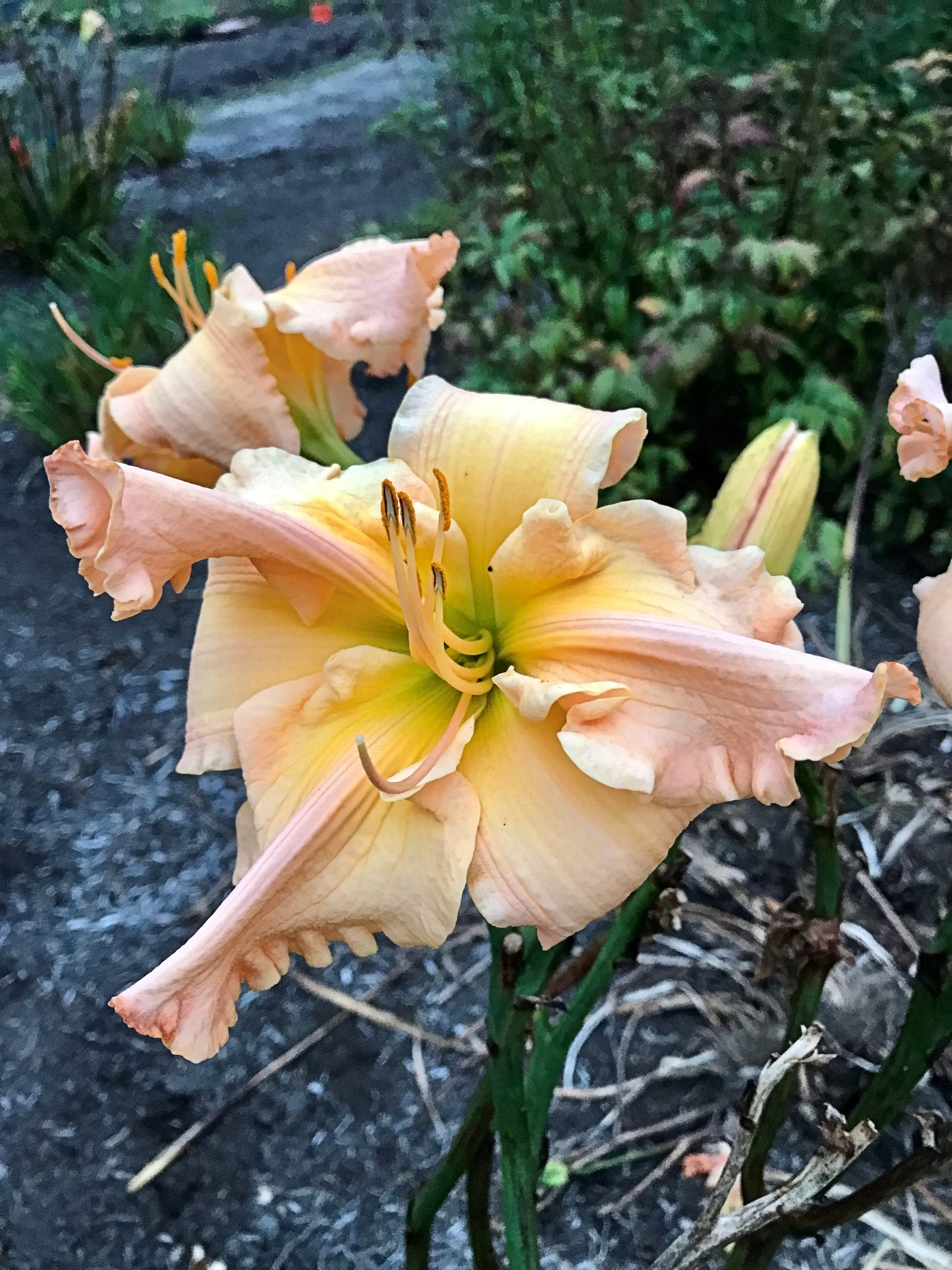 Always mischievous and playful, these 6 inch delicate bisque pink flowers twist and pleat in unpredictable fun. Erect 36 inch scapes  support the dancing blooms with three to four way branching. Fertile both ways. $100