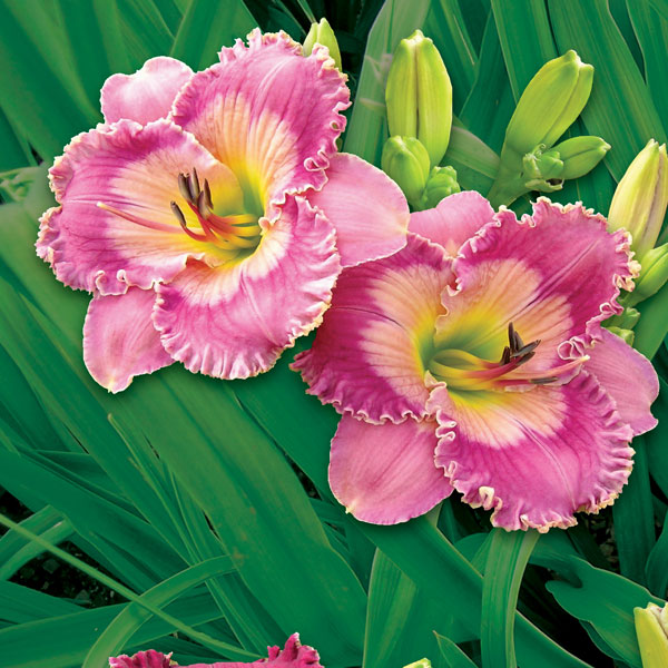 This little piece you’ll want to eat! A delectably sweet and feminine pastel lilac decorated with a circular misty pink watermark. Cute, round and formal, these 5 inch flowers display ornate piecrust ruffles and a textural surface. PANTY CANDY makes an ideal patio specimen with stout 26 inch scapes and three to four way branching. Fertile both ways.