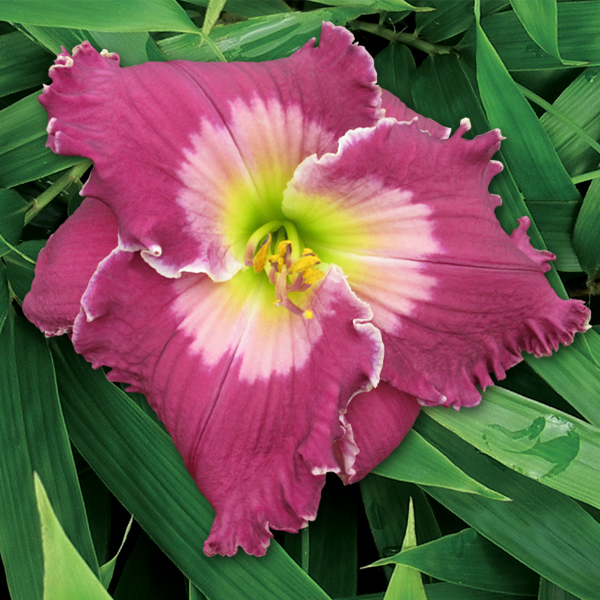 This auspicious cross has produced a remarkable cache of exceptional progeny. SELF-ANOINTED was selected for it’s rich purple color and cleanly defined watermark. These five inch, round, gently reflexed and ruffled blossoms are held on stalwart erect scapes with four to five way branching and consistent rebloom. Very fertile either way.